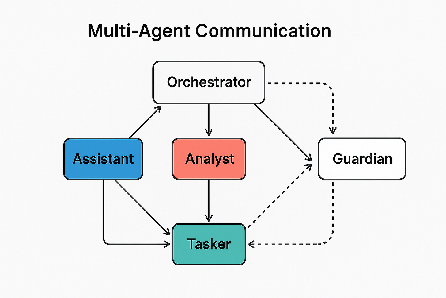 Once you view the agents as distinct intelligences rather than generic tools, the hand-offs between them become the heart of the workflow. The Assistant shapes the problem so the Analyst does not waste time searching for meaning in noise. The Analyst grounds the insight so the Tasker does not execute based on an ambiguous signal. The Orchestrator chooses when each role takes over, maintaining a coherent sense of intent across the whole journey. The Guardian stands slightly apart and sees what the others miss, catching silent drift, policy breaches, and misalignments before they undermine trust.